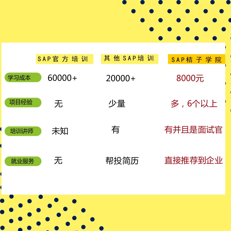 所以我们做到了: 1、项目案例背景全部来自于40多家500强的SAP知名企业,讲师都是项目中的资深sap顾问和项目经理,并且是面试官之一。 2、每期每个顾问只带8名学员,获得专门的辅导、面试、推荐、入职一系列工作 3、报名的学员,在1年内,除了自己老是带给你的项目,你可以免费学习别的顾问带来的所有项目,照这样估算,你一年至少可以获得6个完整的项目经验,如果你真的每个都完全掌握,结果就不用多少了。 4、报名的学员,免费获得全部内部推荐资源,今年到目前已经确认的用人需求已经达到了150人左右。 那培训费用是多少呢?请看下图: